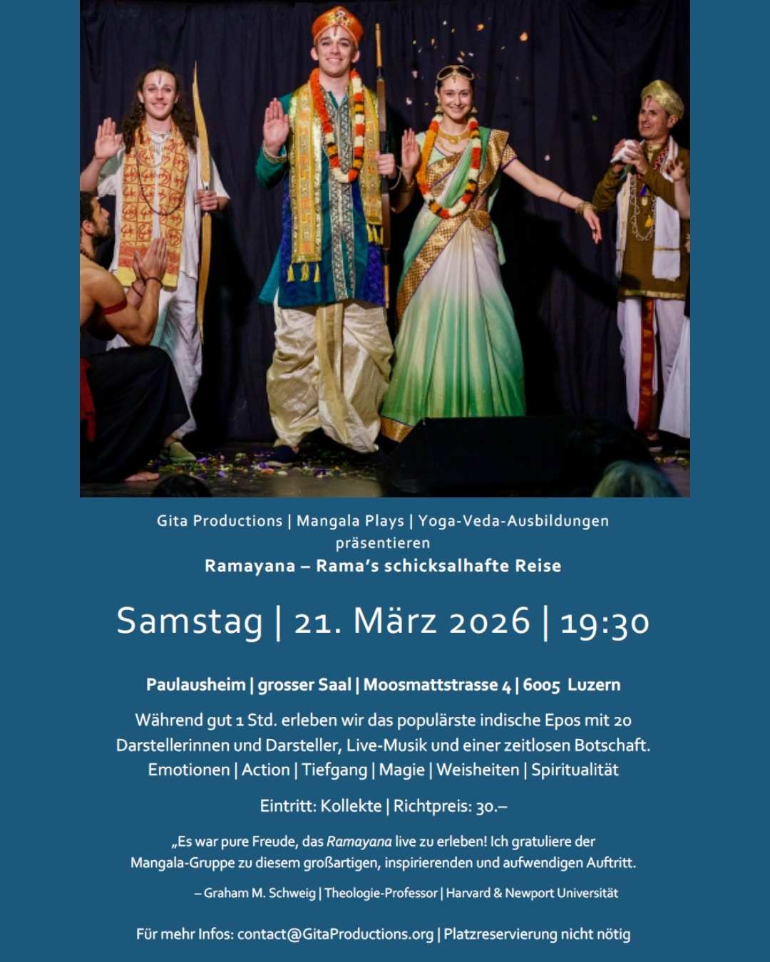 Das Ramayana, eines der bedeutendsten indischen Nationalepen, erzählt die schicksalhafte Reise des Prinzen Rama, der als gerechter König (Avatar von Vishnu) verbannt wird, seine Frau Sita nach ihrer Entführung durch den Dämonenkönig Ravana mit Hilfe eines Affenheeres um Hanuman befreit, das Böse besiegt und nach 14 Jahren als rechtmäßiger Herrscher zurückkehrt.